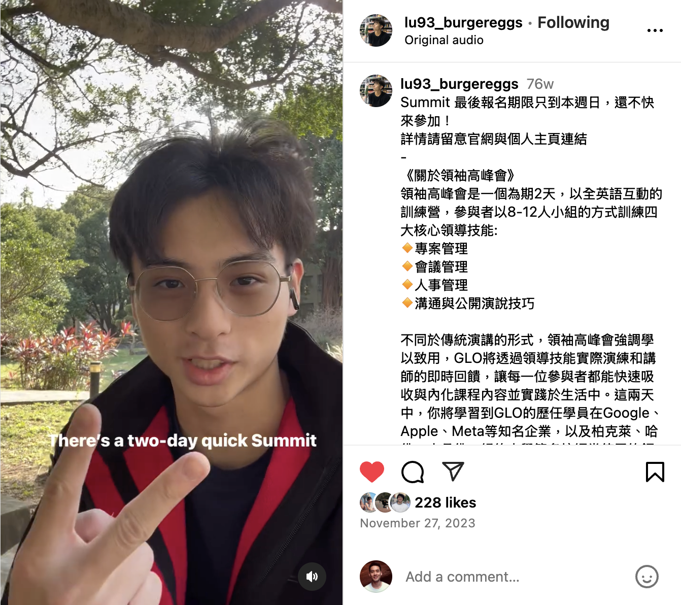「GLO是一個非常高效率的組織,非常喜歡GLO的文化。我認識到很多散佈在全球各地的大家,打開我的視野,可以順便練習英文,並且能嘗試在個人社群發布短影音、貼文!」